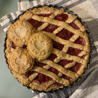 Mescola insieme tutti gli ingredienti della frolla (io ho usato una planetaria con gancio a foglia). L'impasto rimarrà più morbido di quello tradizionale, ma non temere! Tienine da parte un po' per le striscione e metti il restante impasto in una teglia di circa 22 cm, direttamente dandogli la forma con le mani. Bucherella il fondo e metti in frigo a riposare. Stendi l'impasto rimasto per le strisce tra due fogli di carta forno, raggiungendo uno spessore di circa un cm e metti in frigo per una mezz'oretta. Trascorso questo tempo, tira fuori la frolla, metti la composta sulla base e, molto delicatamente, stendi l'impasto restante (sempre lasciandolo tra la carta forno e aggiungendo un po' di farina se troppo appiccicoso) e crea delle striscioline. Farai un po, fatica ma è normale! Aiutati con una spatola per sollevarle! Ne varrà la pena! Inforna a 180 gradi per circa 25'.